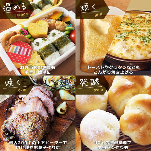 あたため・解凍(レンジ)、トースト(グリル)、お菓子作り(オーブン)がこれ1台でできます。