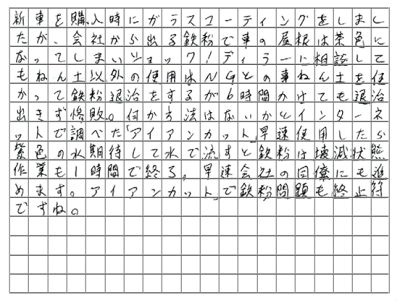 新車を購入時にガラスコーティングをしましたが、会社から出る鉄粉で車の屋根は茶色になってしまいショック! ディラーに相談してもねん土以外の使用はNGとの事ねん土を使かって鉄粉退治をするが6時間かけても退治出きず惨敗。